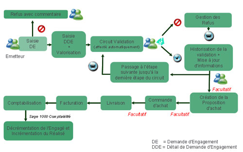 - Circuits de validation ouverts et contextuels : un circuit peut être défini librement en nombre d'étapes ou natures d'étapes ; chaque circuit de validation pouvant être affecté à un engagement en fonction de différents critères